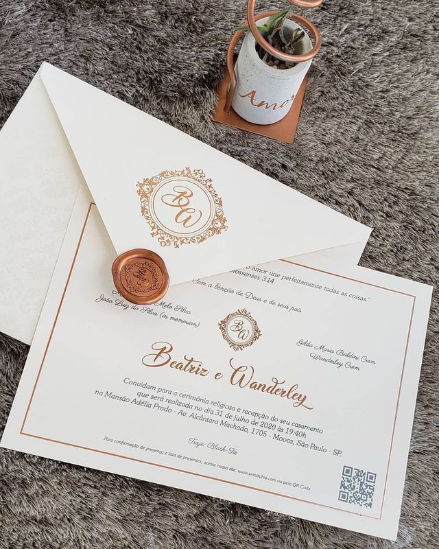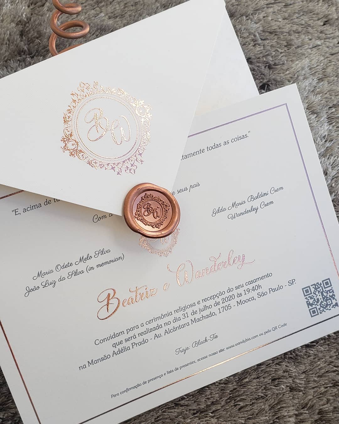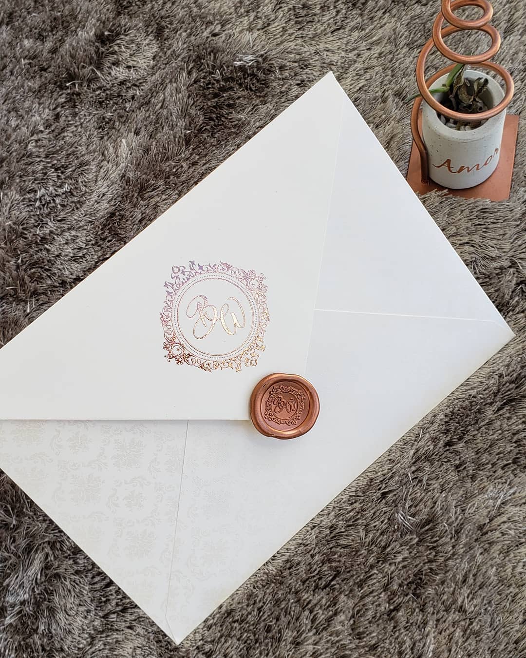 Envelope em Markatto com Serigrafia Perolisada, Relevo Metalic Rosê Gold no brasão e fechamento com Lacre de Cera.