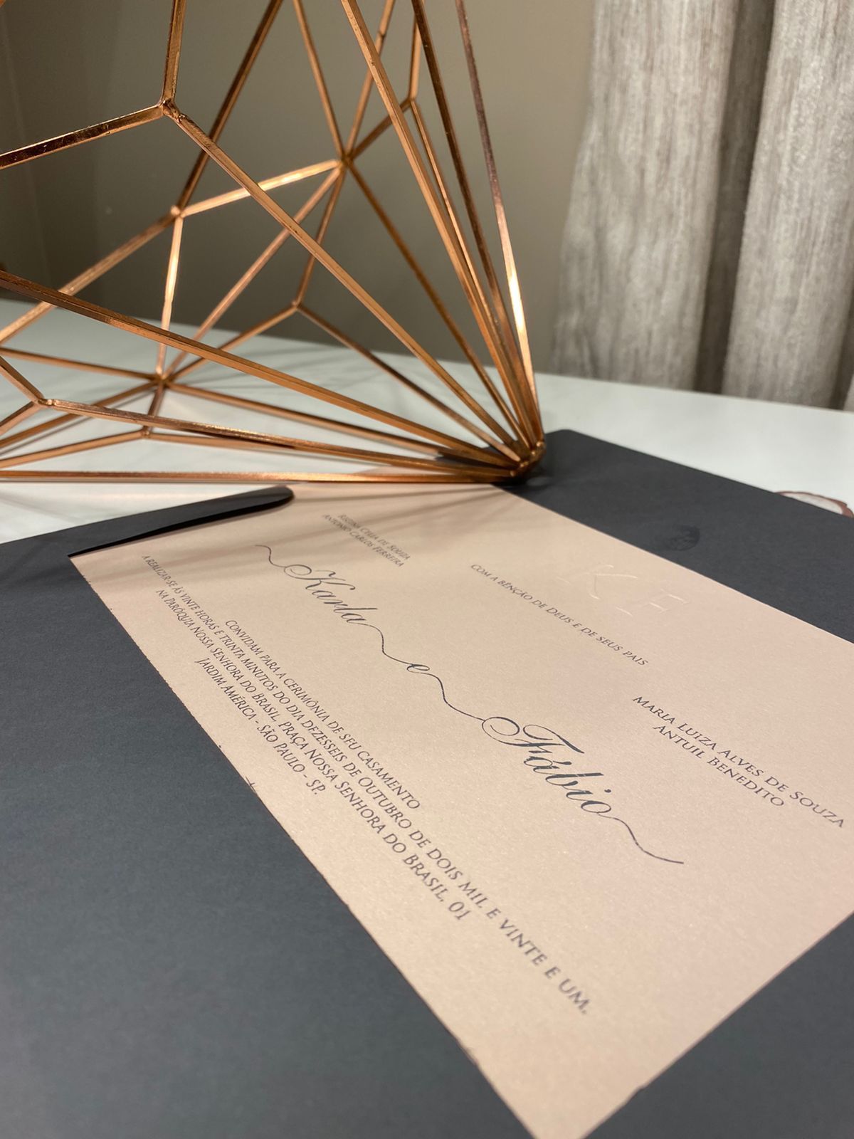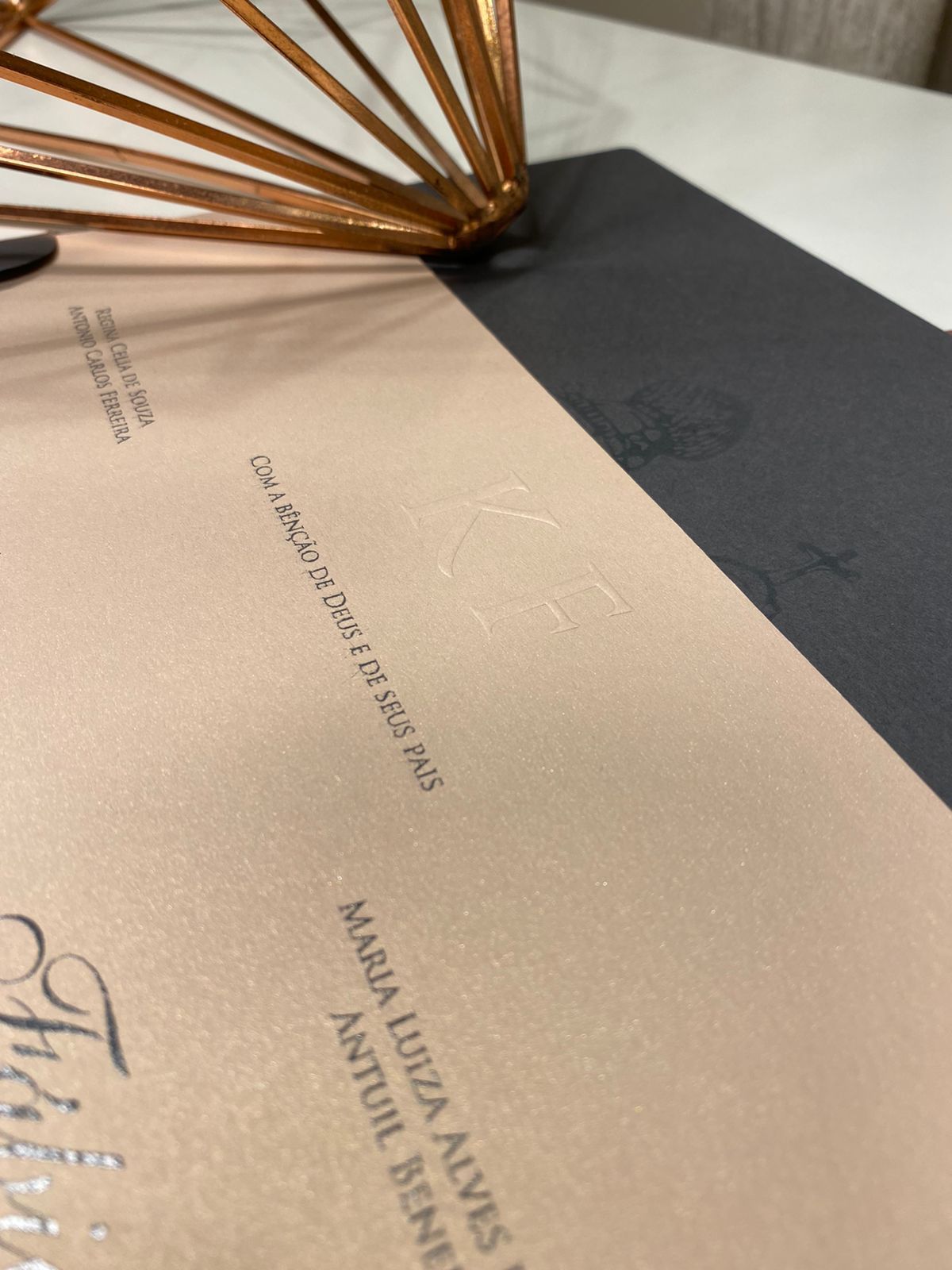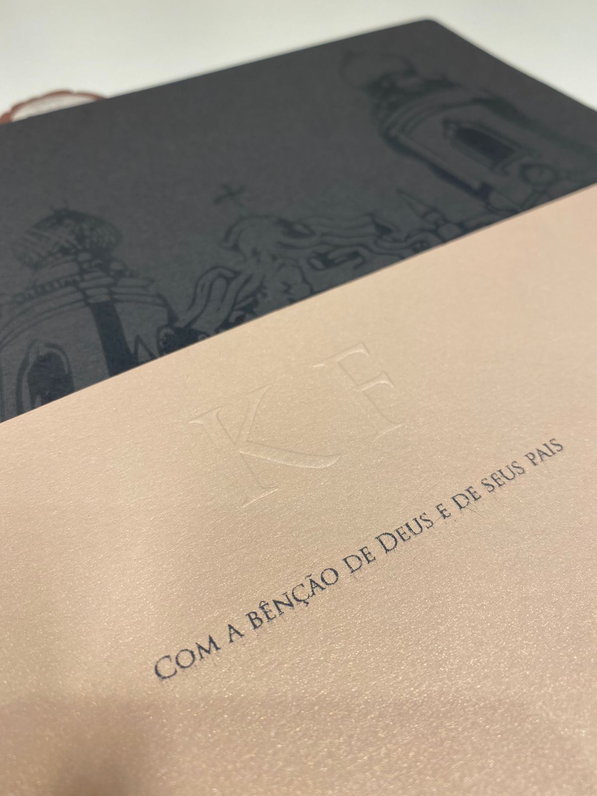 Convite em Courious Nude com impressão em Relevo Grafite e Monograma em Relevo Seco.