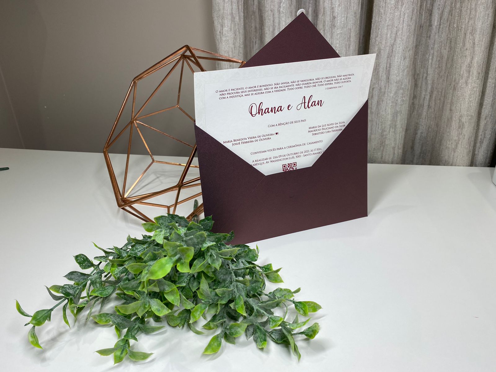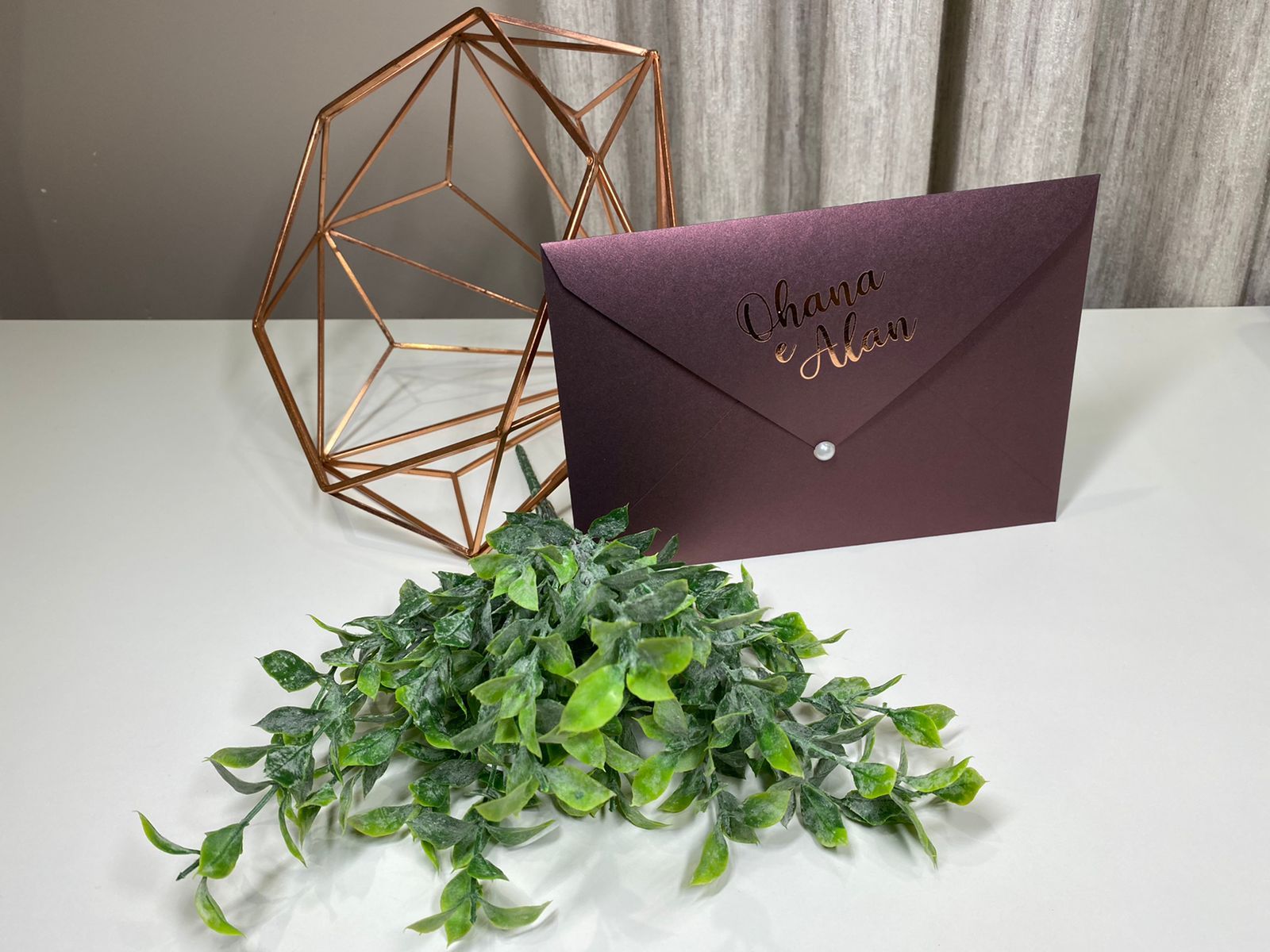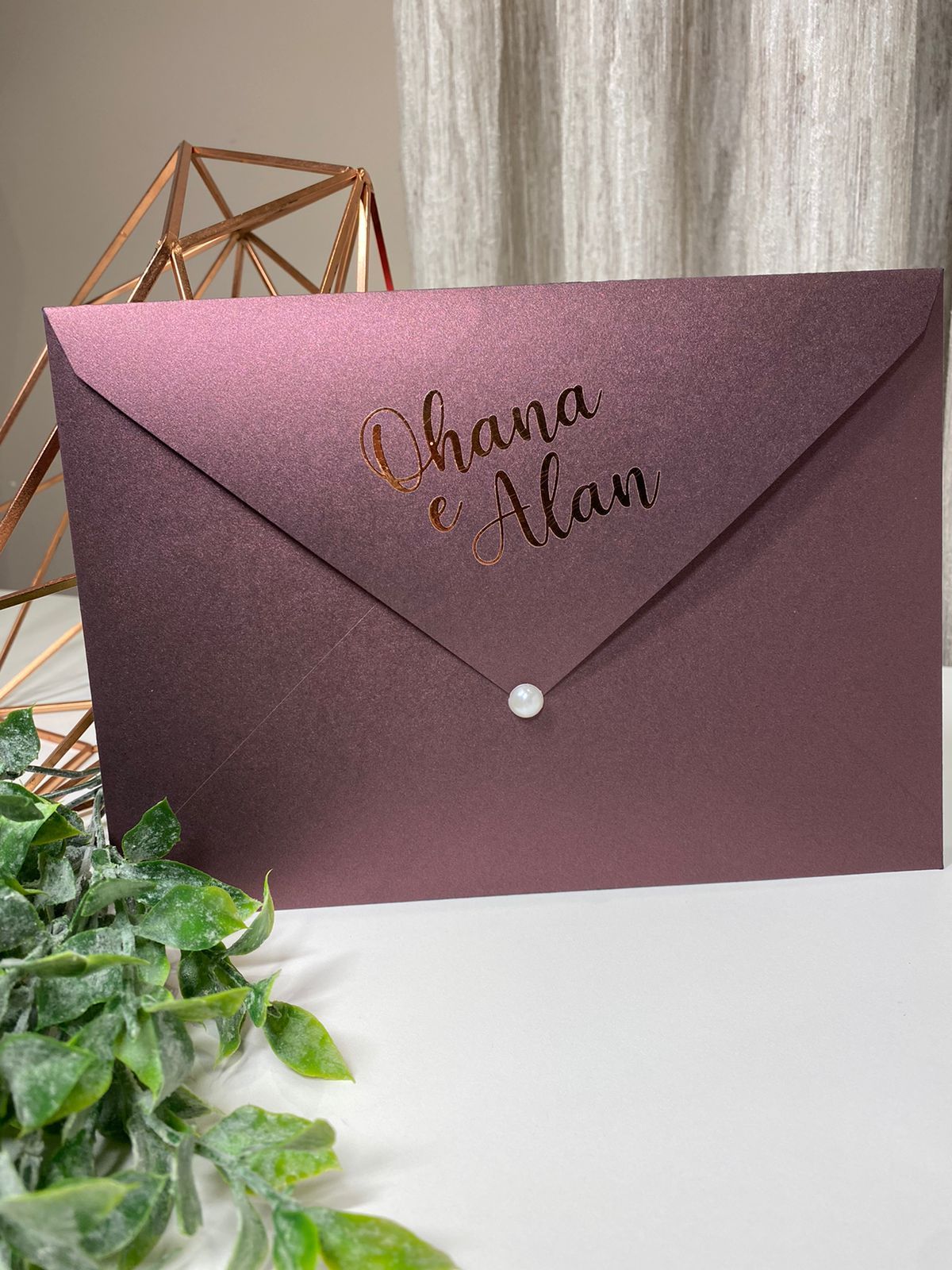 Envelope em Markatto com Relevo Metalic Rosê Gold nos nomes e fechamento com Botão Pérola.