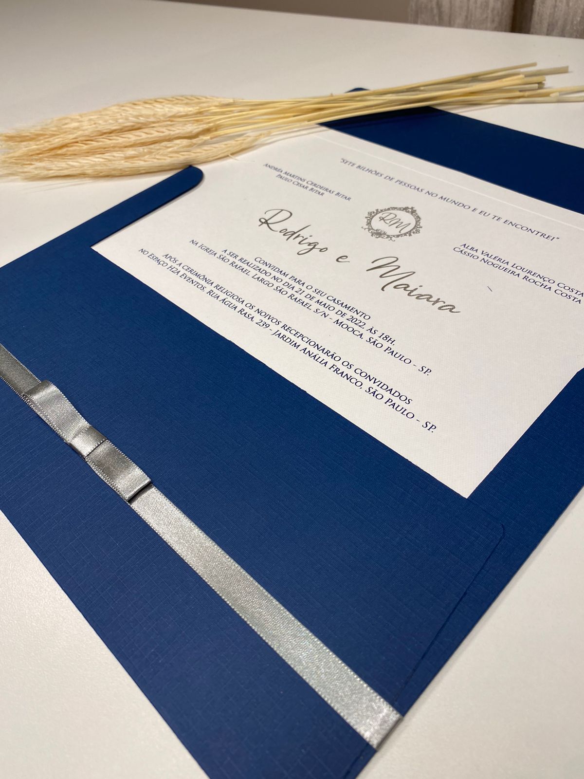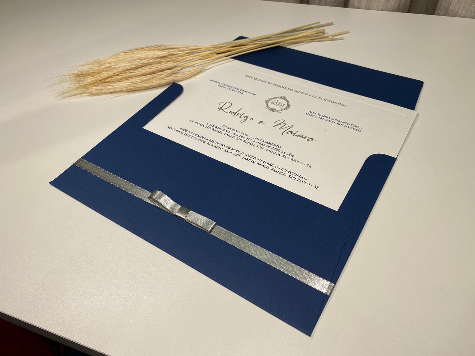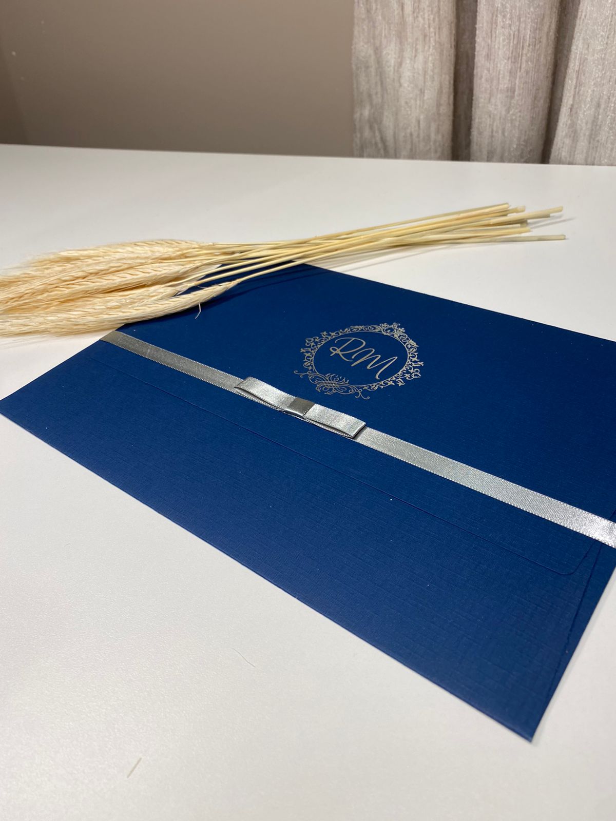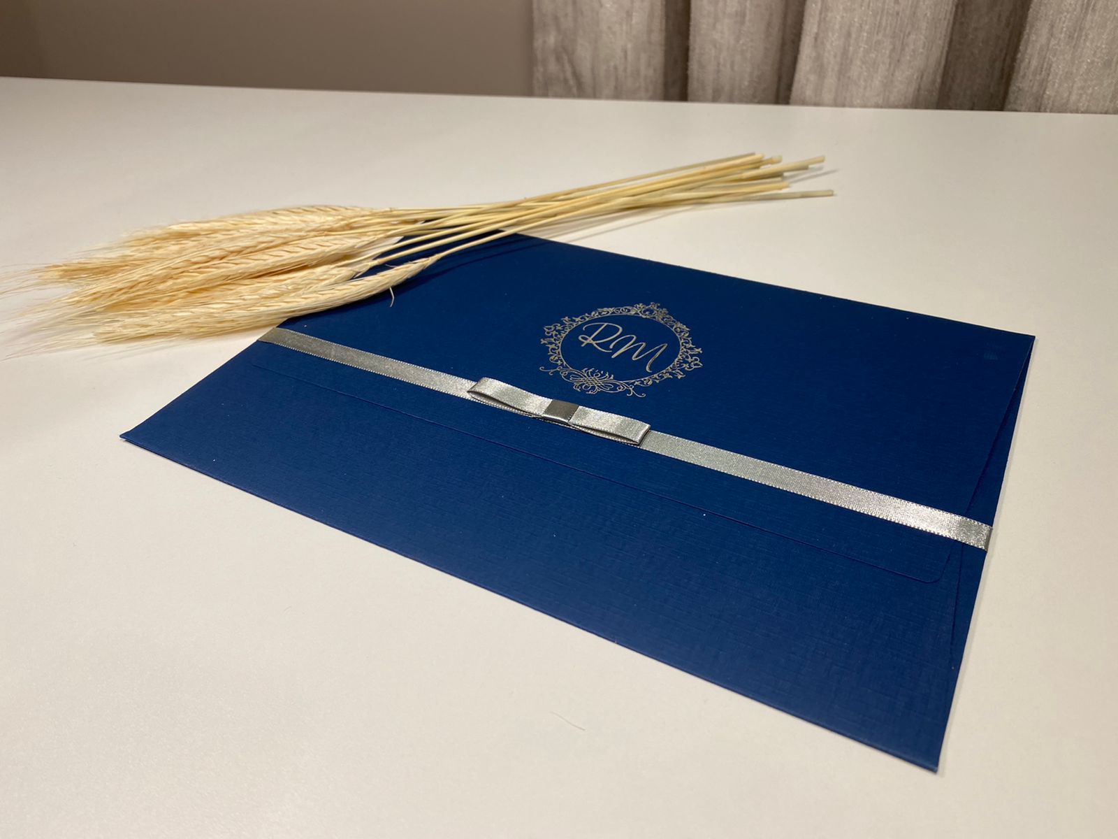 Convite em Markatto Bianco com impressão em Relevo Azul Marinho e Metalic Prata no brasão e nomes.