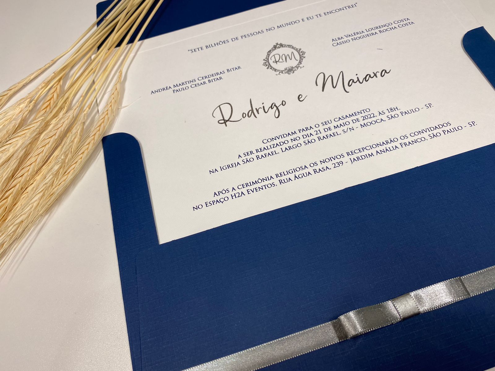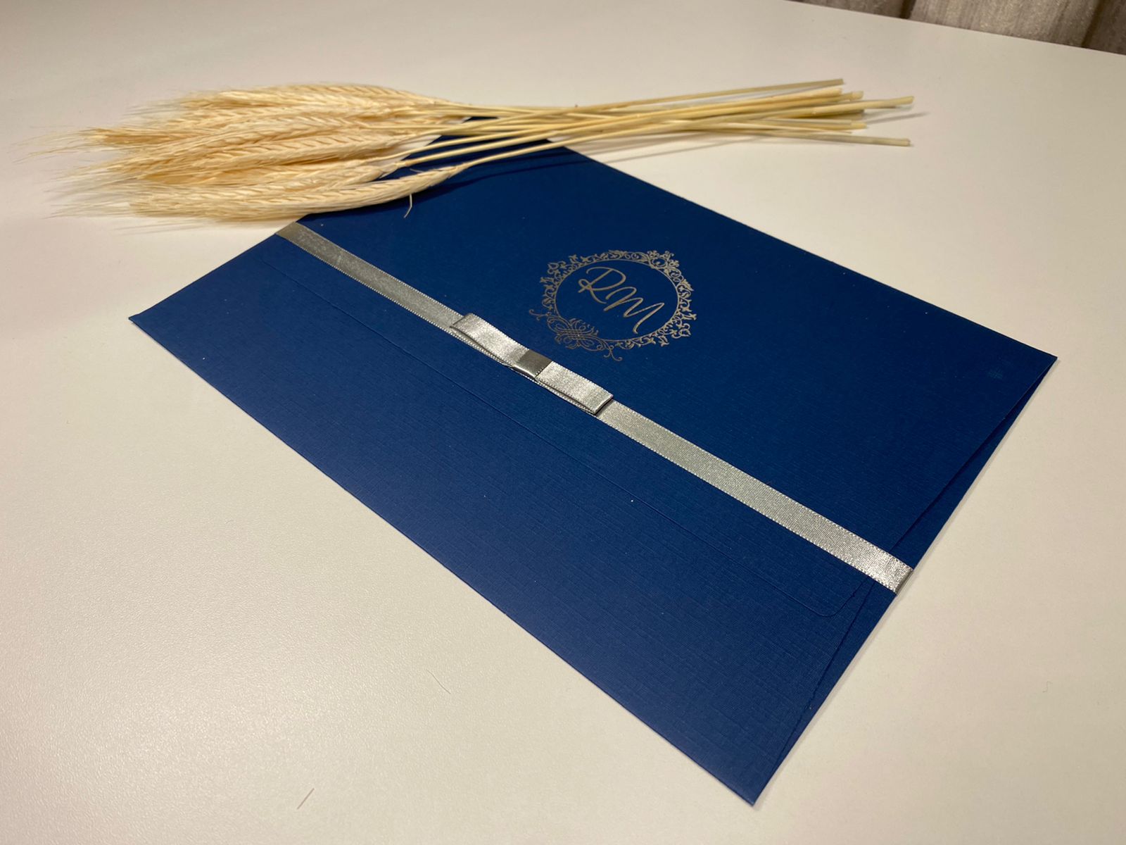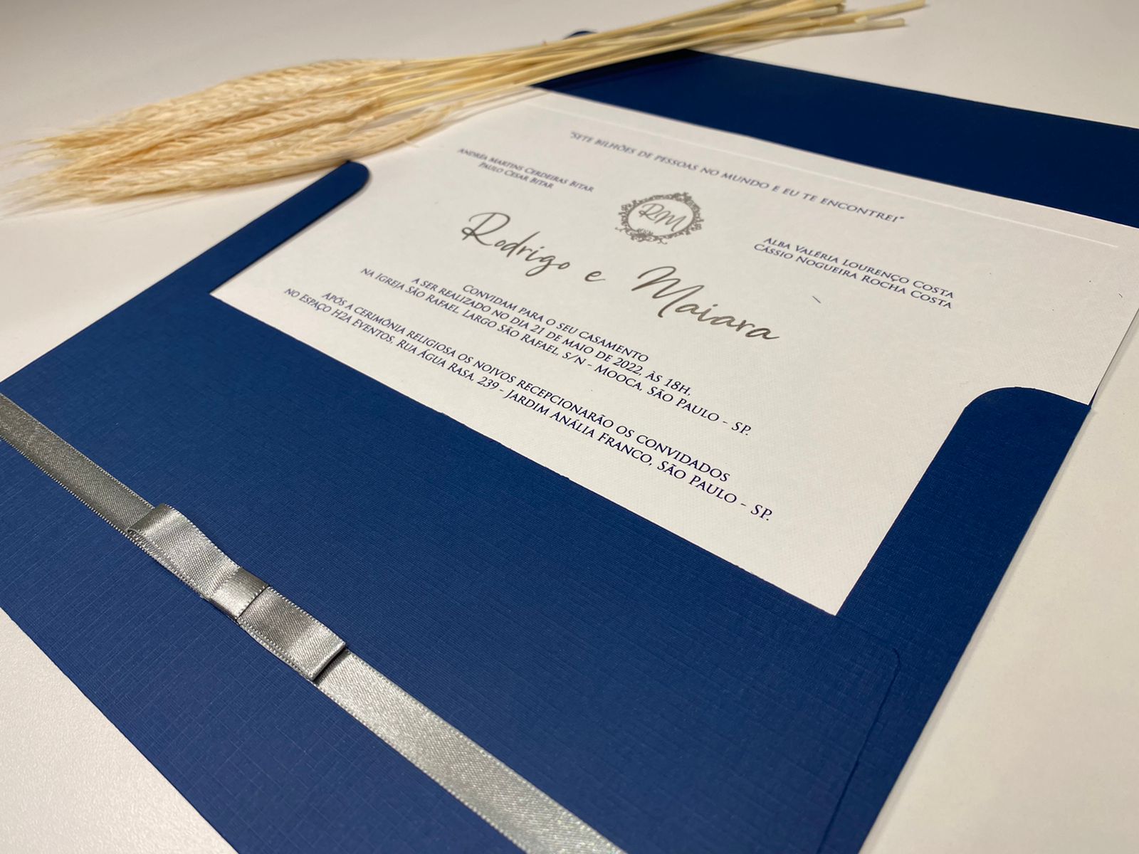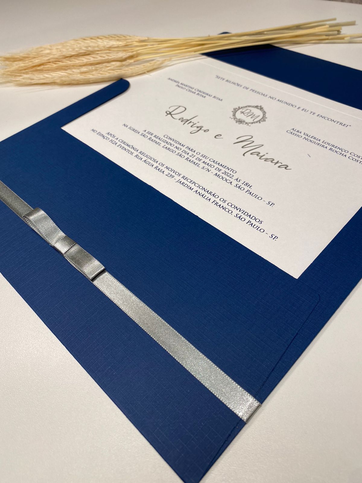 Convite em Markatto Bianco com impressão em Relevo Azul Marinho e Metalic Prata no brasão e nomes.