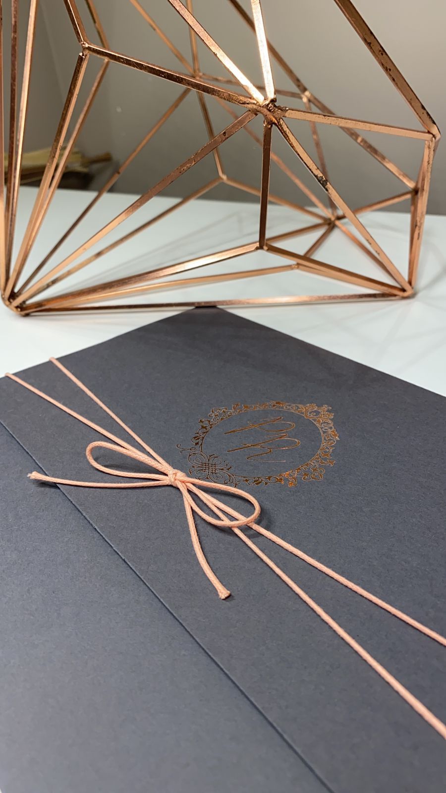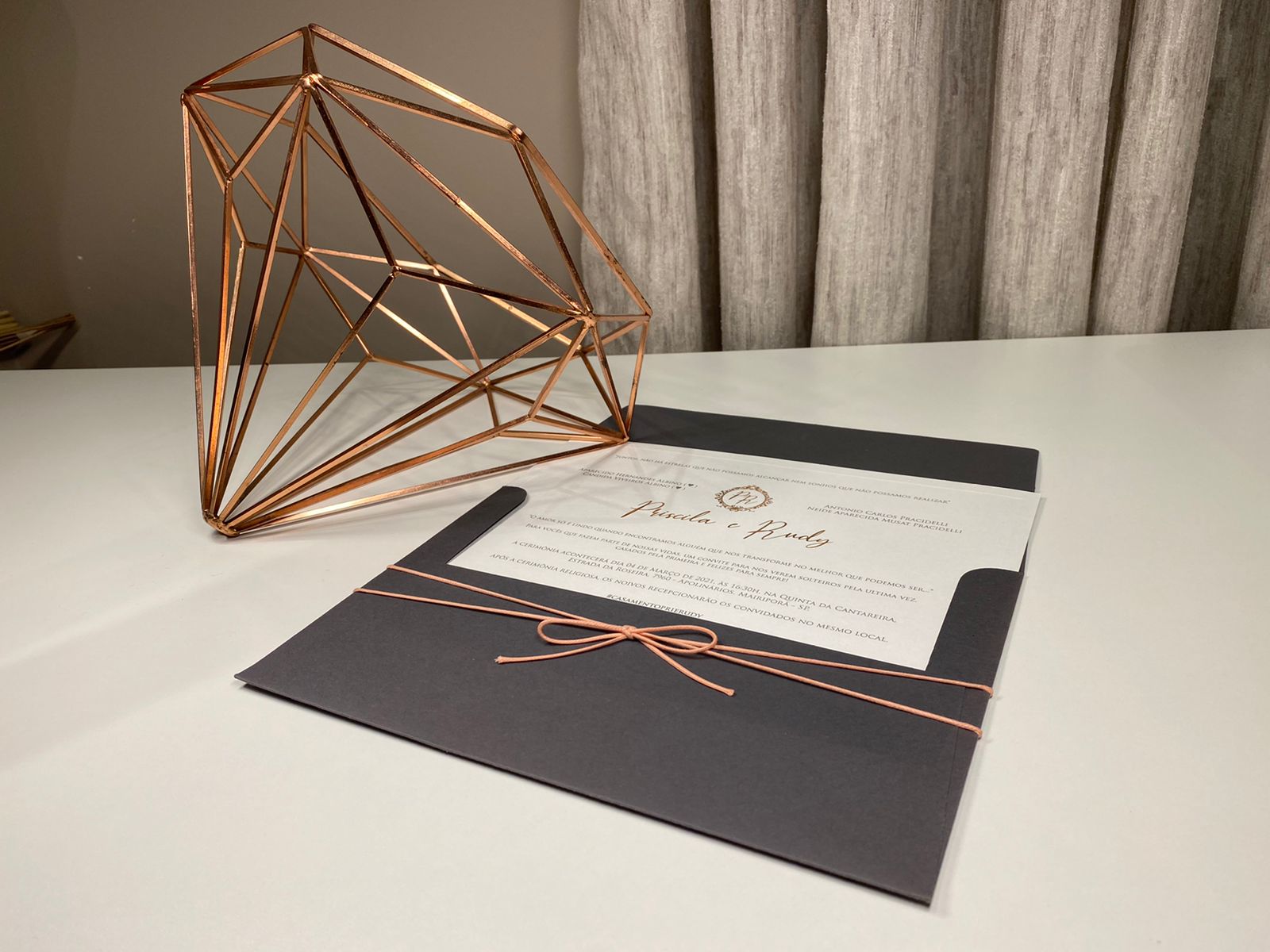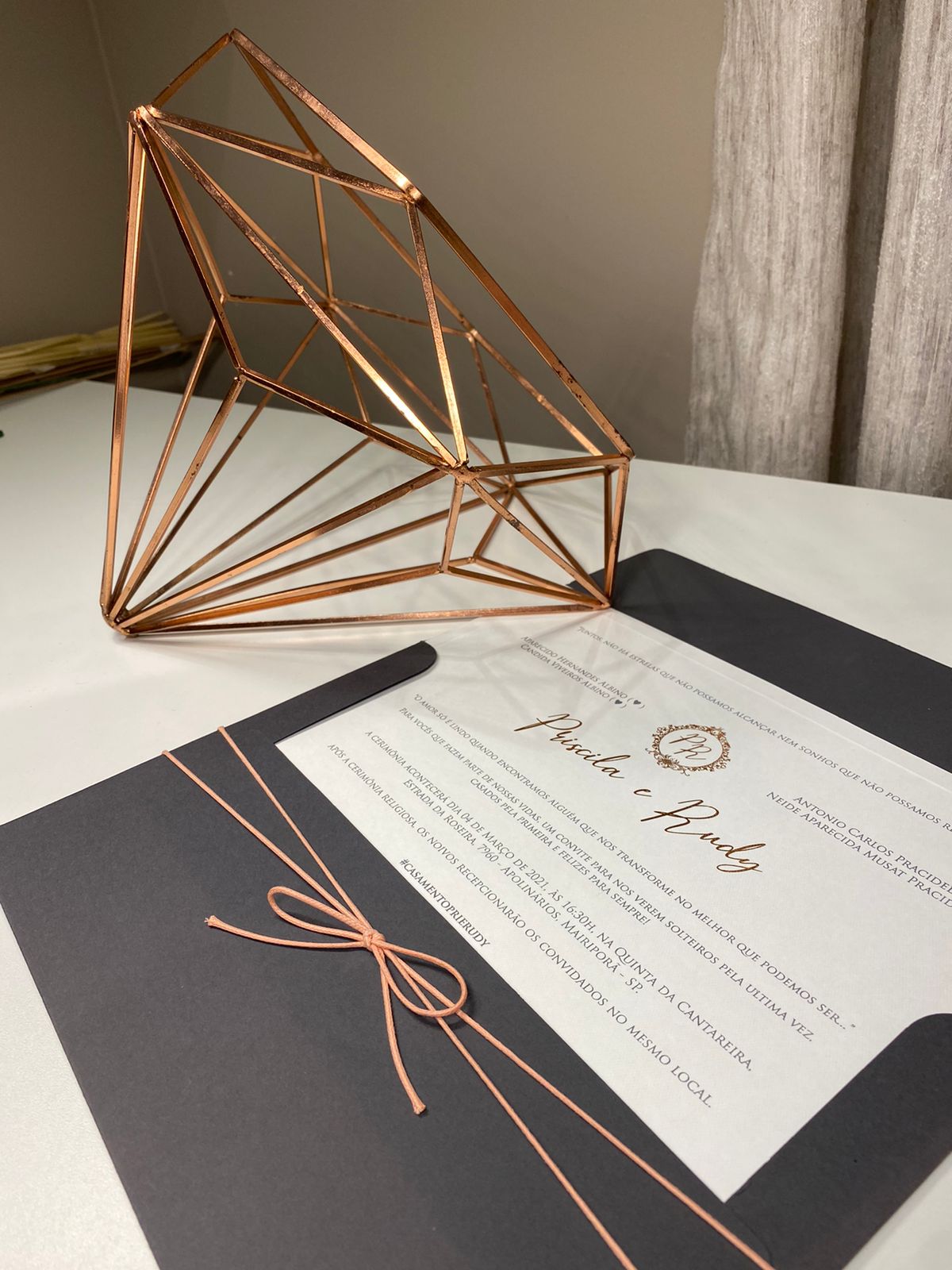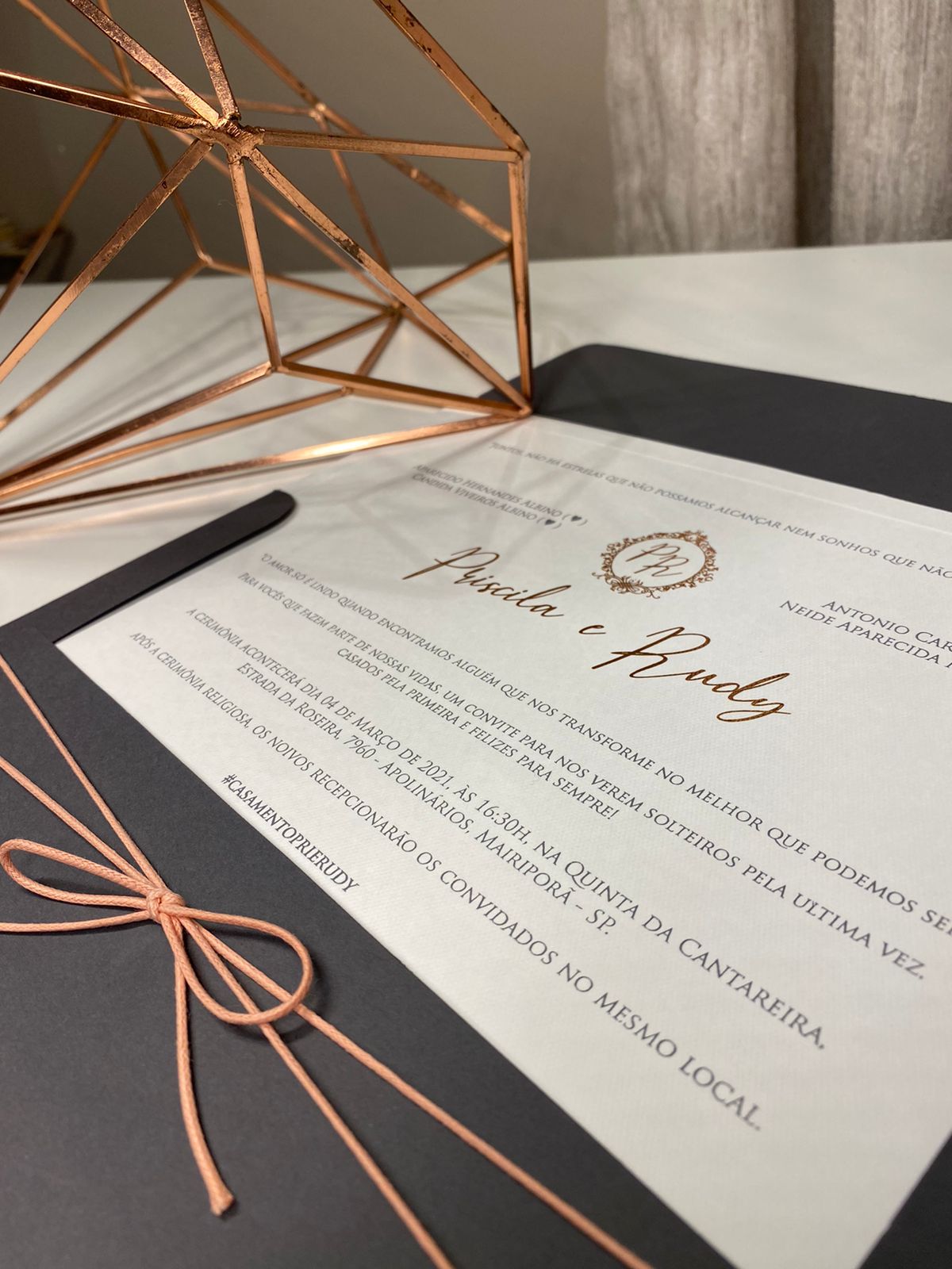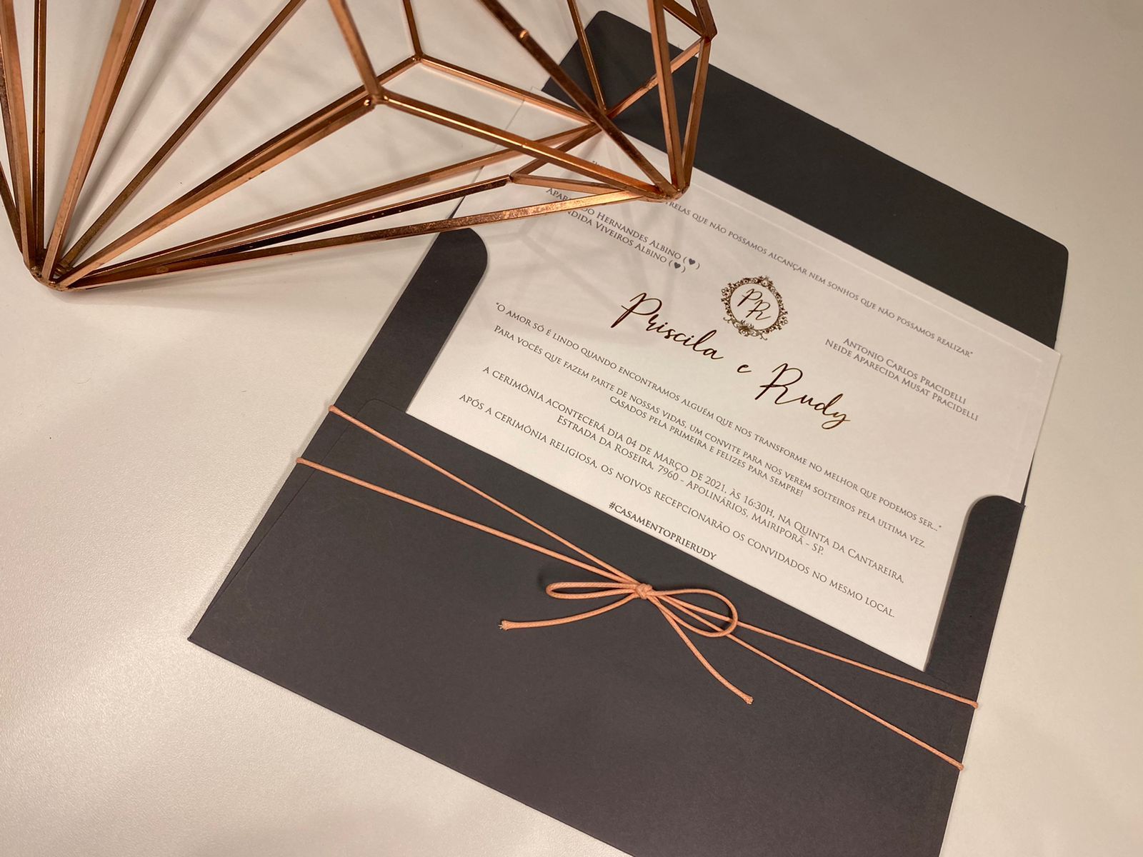 Convite em Markatto com impressão em Relevo e brasão e nomes em Metalic Rosê Gold.